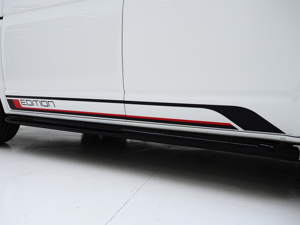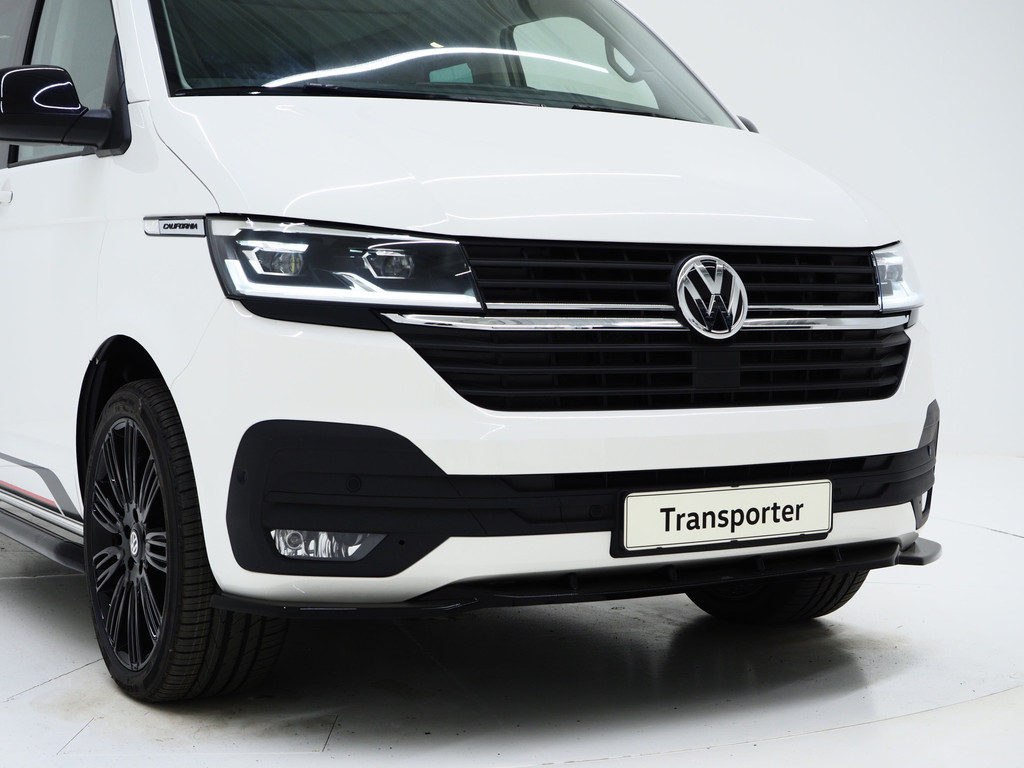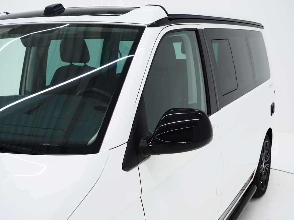 Volkswagen California T6.1 Edition met hoogglans zwarte raamlijsten, zwart dak, sidebars, bumperdetails, frontsplitter, zwarte spiegelkappen en hooglans zwarte velgen.